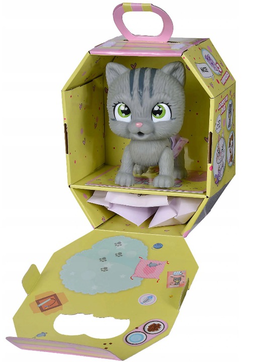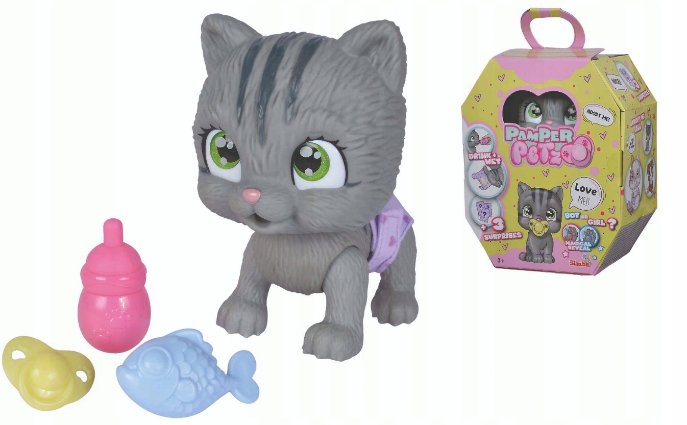 • – w zestawie znajduje się 15 centymetrowy pupilek z funkcją siusiania ubrany w pieluszkę, 3 niespodzianki (buteleczka, smoczek oraz smakołyk) i certyfikat adopcyjny