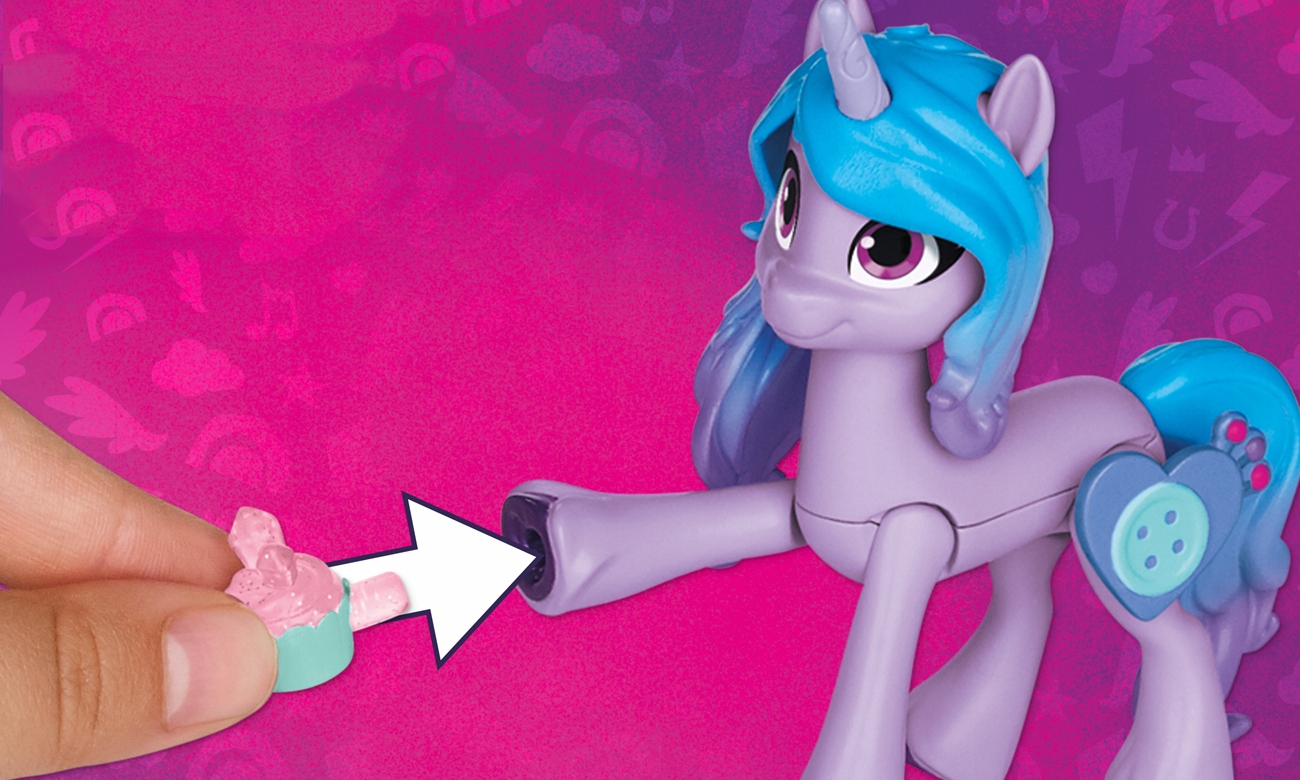 Figurka różowego jednorożca z niebiesko-fioletową grzywą i ogonem ombre jest ruchoma, a w kopytku może trzymać niektóre akcesoria z zestawu, np. filiżankę lub babeczkę. Piękna Izzy jest prawie gotowa na przyjęcie gości! Trzeba tylko doczepić do jej nóżki znaczek cutie mark w kształcie serca z guzikiem. I gotowe! Hmmm, a może jeszcze założyć bransoletkę na kopytko?