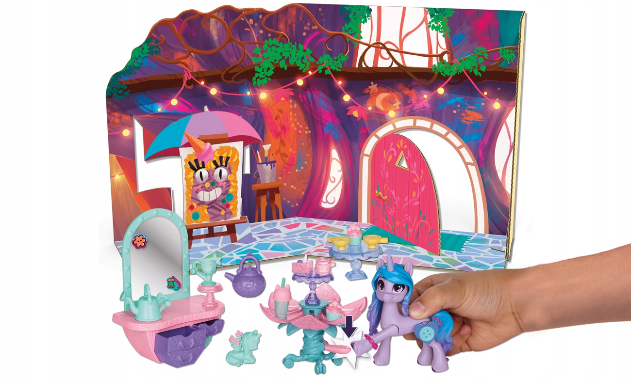 Jednorożce uwielbiają herbatę. Urządź podwieczorek w pracowni malarskiej Izzy – ustaw stoliczki, nastaw imbryczek, a na paterze rozłóż smakowite babeczki i koktajl. W domu konika znajdziesz też toaletkę z szufladami, w których możesz przechowywać drobiazgi.