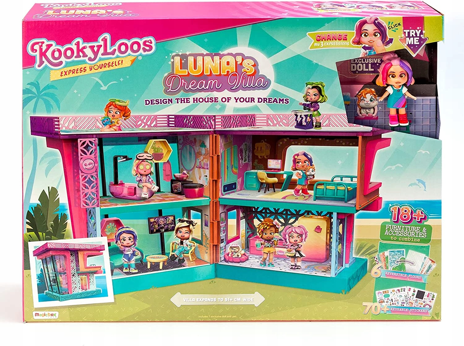 Wymarzony domek Luny to fantastyczny i rozbudowany zestaw do zabawy, który sprawdzi się dla wszystkich miłośniczek serii KookyLoos. Konstrukcja domku ma dwa piętra i składa się z czterech pomieszczeń – w każdym pokoiku nie brak akcesoriów i dodatków, jakie zainspirują dzieci do wymyślania wspaniałych przygód uroczych laleczek. Luna może zaprosić swoje przyjaciółki, by zorganizować domowe SPA w swojej łazience, przygotować pyszne smakołyki w kuchni, obejrzeć koncert w Sali kinowej lub rozwikłać kolejną zagadkę matematyczną w swojej sypialni. Na dachu domku znajduje się wielki taras, z którego można spoglądać na okolicę.