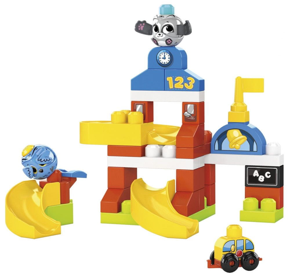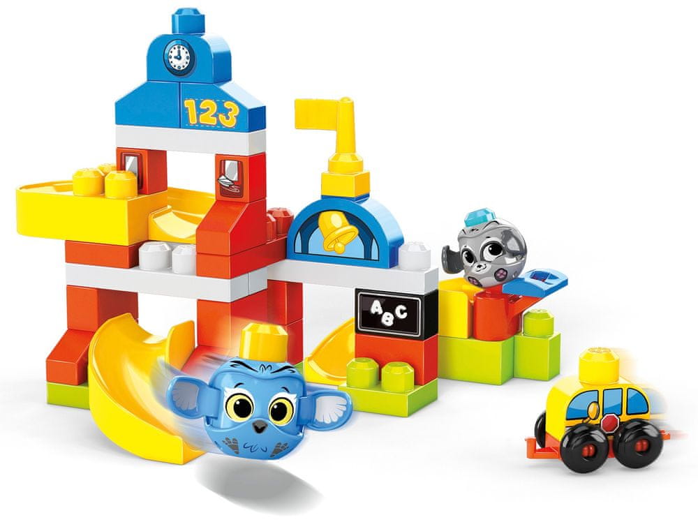 Zestaw konstrukcyjny składa się z 2 zwierzątek peep-pee, 35 solidnych dużych klocków, 1 autobusu szkolnego na kółkach, 3 zjeżdżalni i kamienia startowego.