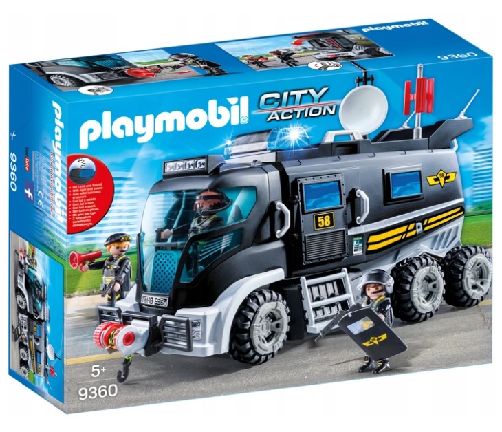 SWAT to wyspecjalizowana jednostka policji stworzona do przeprowadzania bardzo niebezpiecznych działań. Tworzą ją doskonale wyszkoleni funkcjonariusze, którzy przygotowani są na sytuacje wymagające szybkiej, profesjonalnie przygotowanej akcji. Policjanci wyposażeni są w wyspecjalizowaną broń i ekwipunek, dostosowane do działań, które przeprowadzają. Zestaw Playmobil zawiera pojazd jednostki specjalnej z efektem świetlnym i dźwiękowym. Zdejmowany dach i otwierana kabina ułatwia zabawę we wnętrzu pojazdu. Trzy figurki tajnych agentów mają do dyspozycji profesjonalny sprzęt i uzbrojenie.