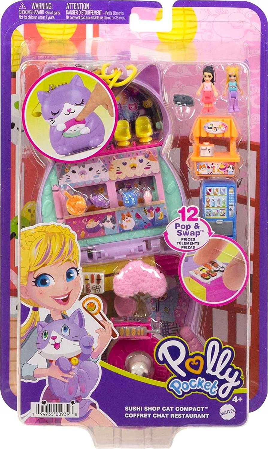 • Zestaw kompaktowy Restauracja Kotek Zen ma kształt kotka z kawałkiem sushi z miękkiej pianki. Otwórz zestaw, aby odsłonić japońską restaurację sushi. Zestaw zawiera mikrolalki Polly i przyjaciółkę.