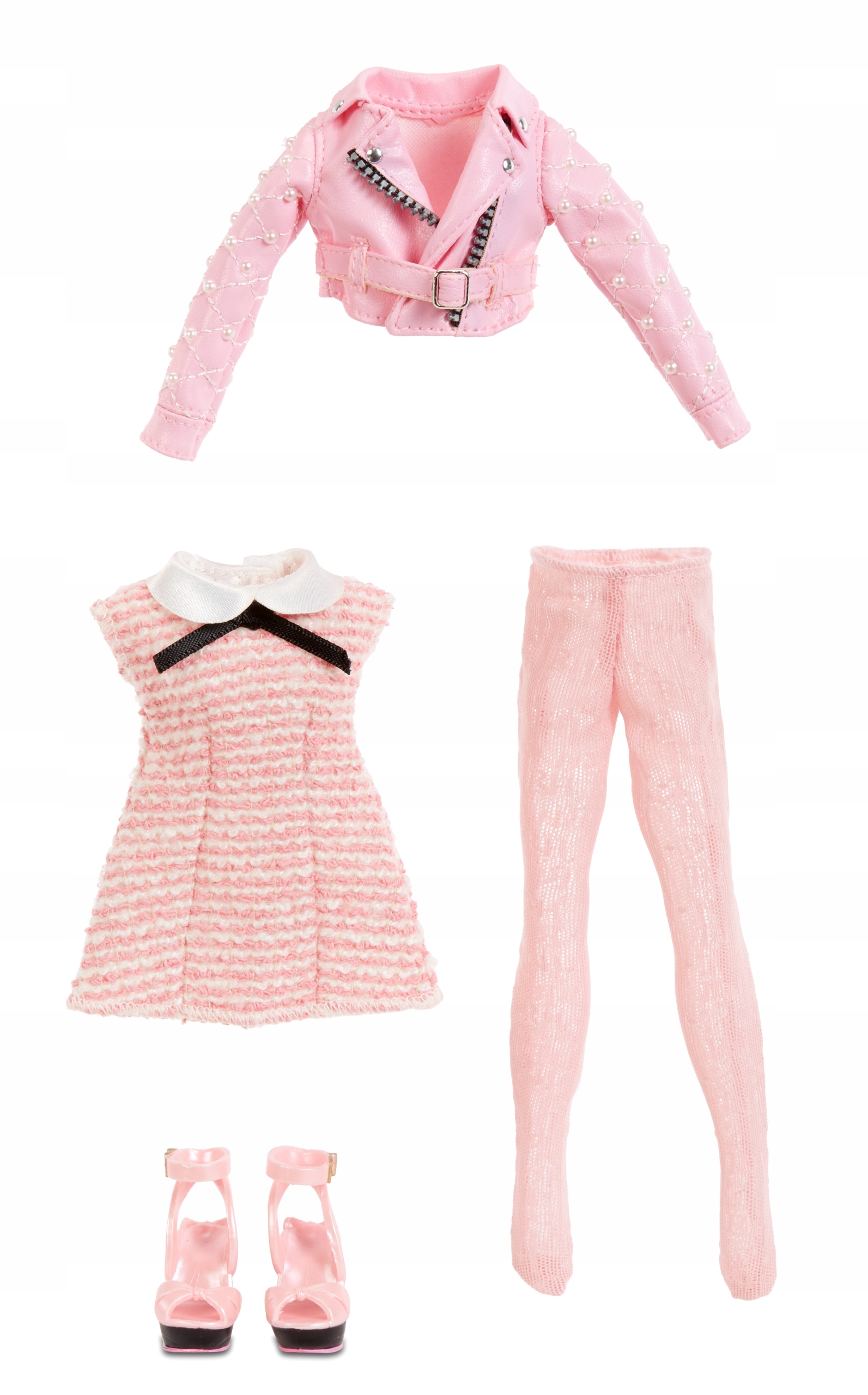 - 2 stroje z serii mix & match – do dowolnego dobierania, miksowania i tworzenia własnych stylizacji: tweedowa spódniczka, żakiecik, stylowa koszulka, dopasowana sukienka, różowa kurtka w stylu motocyklowym, rajstopy, zakolanówki, 2 pary butów na obcasie