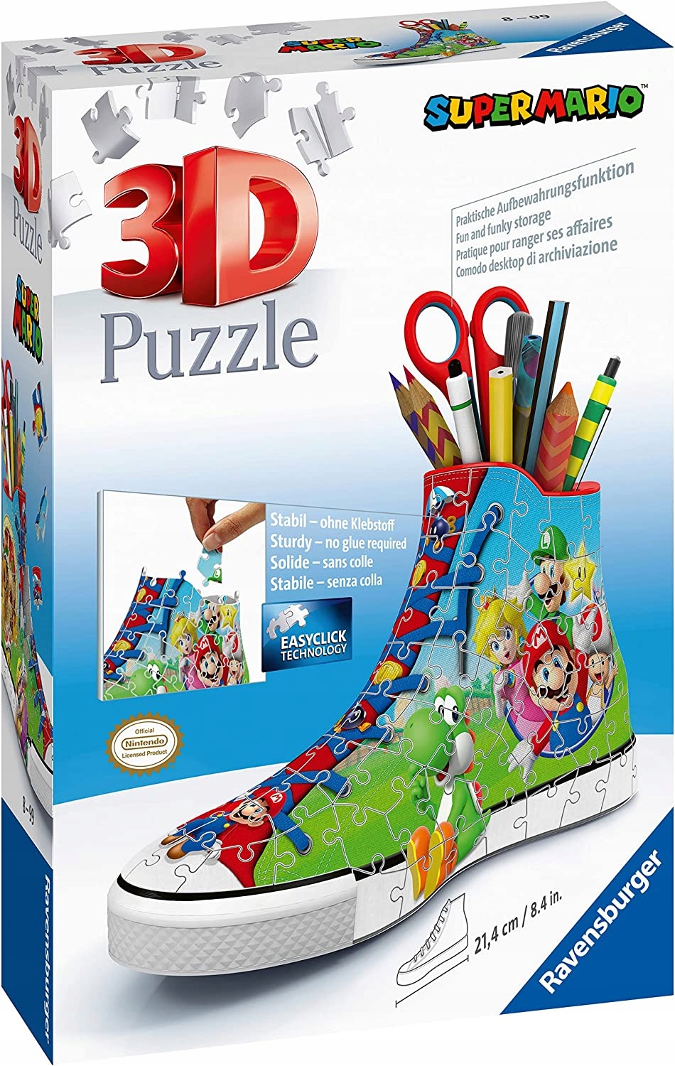 Twórz wyjątkowe konstrukcje 3D z puzzlami 3D od firmy Ravensburger! Odkryj nowy, trójwymiarowy sposób układania puzzli. Elementy tych puzzli zostały wykonane ze sztywnego tworzywa sztucznego, które pozwala na utrzymanie się konstrukcji bez użycia kleju. Ułożone przedmioty nie rozwarstwiają się, a puzzle mocno trzymają się siebie. Materiał użyty do produkcji klocków jest łatwy w czyszczeniu, wystarczy użyć wilgotnej szmatki. Trampek z motywem Super Mario to konstrukcja dla wielbicieli kosmosu z puzzli 3D, która łączy przyjemne z pożytecznym rozwija wyobraźnię przestrzenną, a po złożeniu może posłużyć jako przybornik. Zawartość i cechy zestawu: 108 elementów puzzli przeznaczony dla dzieci od 8. roku życia 3 dodatkowe elementy