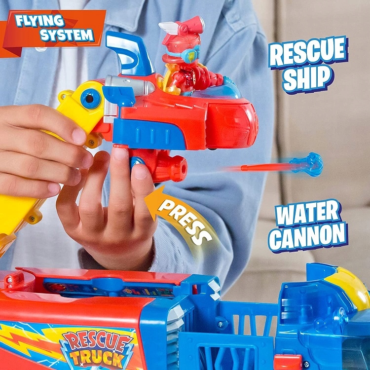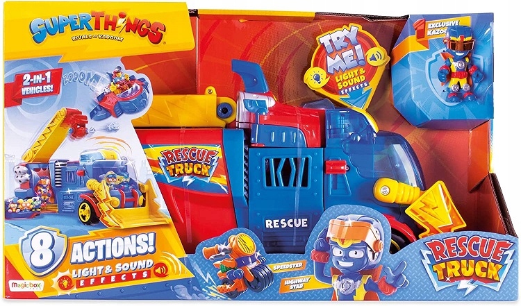 Ekipa dzielnych postaci Super Things z najnowszej, 10. serii Rescue Force, wyposażona została we wspaniałą ciężarówkę, przeznaczoną do zadań specjalnych! Dzięki pojazdowi najnowszej generacji dzielni bohaterowie będą mogli w jeszcze ciekawszy i bardziej zaciekły sposób walczyć ze swoimi przeciwnikami, pustoszącymi Kaboom City. Pojazd Rescue Truck jest czerwono – niebieskiego koloru z żółtymi elementami dodatkowymi i stanowi kompilację kilku mniejszych maszyn. Na przednim zderzaku znajduje się bowiem fragment koparki, na ruchomym wysięgniku ulokowano miejsce operacyjne dla bohatera Kazoom Kid – może on skorzystać z wodnej armatki, aktywowanej przez niebieski przycisk! Kokpit posiada transparentną przednią szybkę, a wnętrze ciężarówki wyposażone jest w miejsca dla małych figurek Super Zings, ale też w magiczną kapsułę energetyczną!