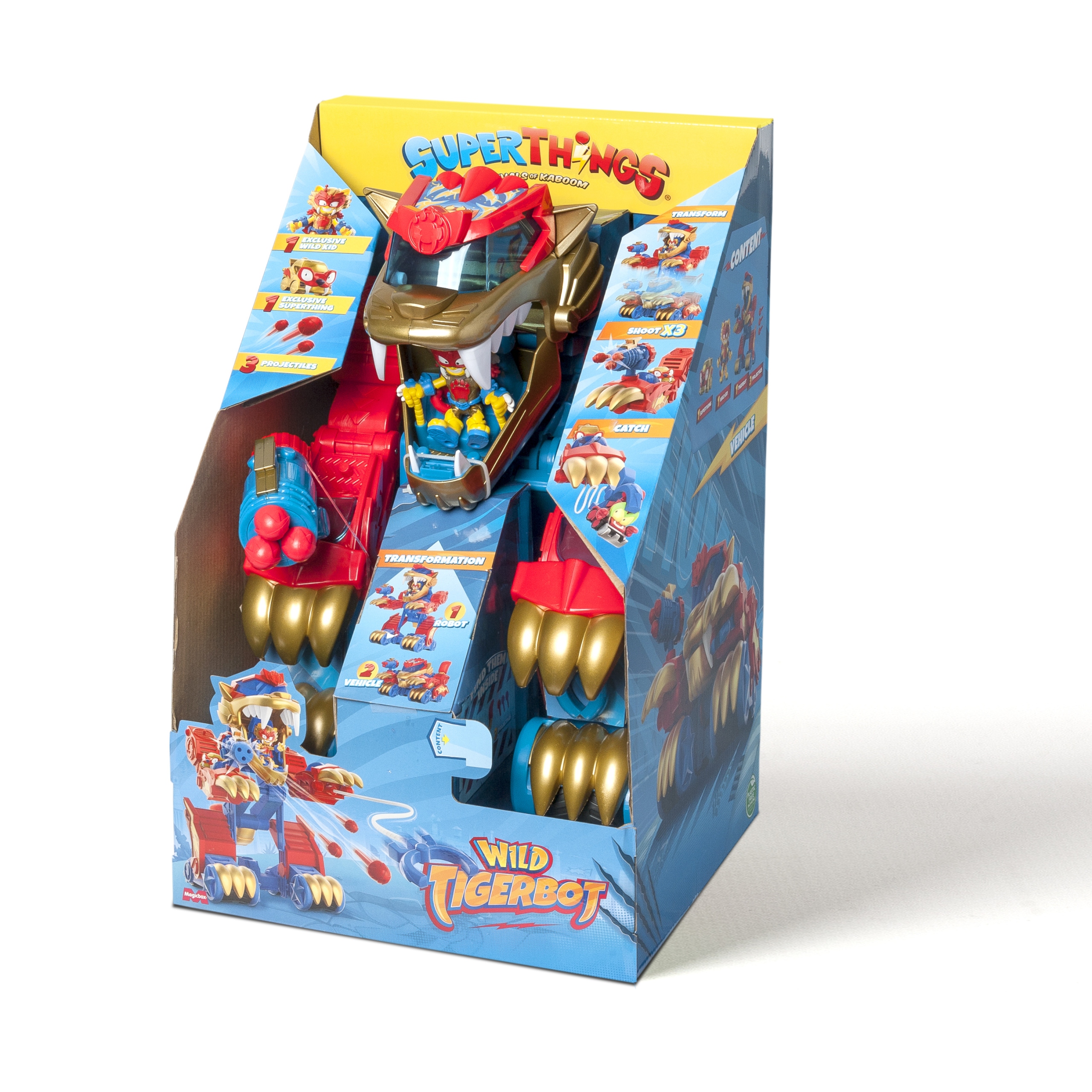 To szybki bolid… A teraz to gigantyczny robot! To największa bestia w Kaboom City, której siła jest również gigantyczna! To SuperThings Wild Tigerbot!Wystarczy jeden gest, by przeszedł transformację – naciśnij jego ogon, a przejdzie z trybu RACE (pościg) do trybu ATTACK (atak). Za pomocą swoich pazurów może wystrzelić szczypce, by schwytać SuperThingsy i za pomocą przycisku ściągnąć je do siebie. Dodatkowo jeden z pazurów ma specjalną armatkę z aż trzema pociskami!W zestawie znajdują się ekskluzywne postacie: Wild Kid i Wild Superthing. Mogą sterować robotem z kokpitu znajdującego się wewnątrz paszczy tygrysa. Co za emocje!Zawartość: