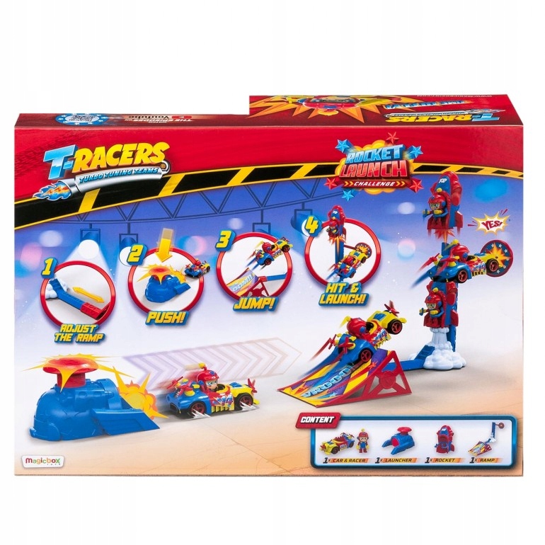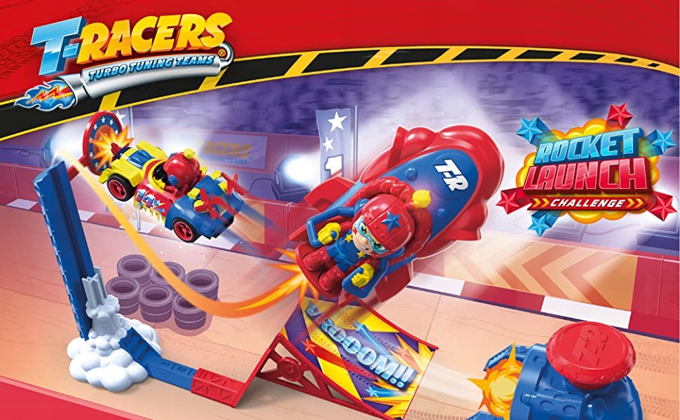 Czas to udowodnić! Umieść swojego T-Racera w pojeździe, wyceluj, skalibruj siłę i… startuj! Czy udało Ci się trafić w tarczę? Jeśli uda Ci się dobrze wycelować, wyślesz rakietę na księżyc! Jeśli nie, nie poddawaj się i spróbuj jeszcze raz! Ile razy z rzędu uda ci się trafić do celu? Emocje gwarantowane!