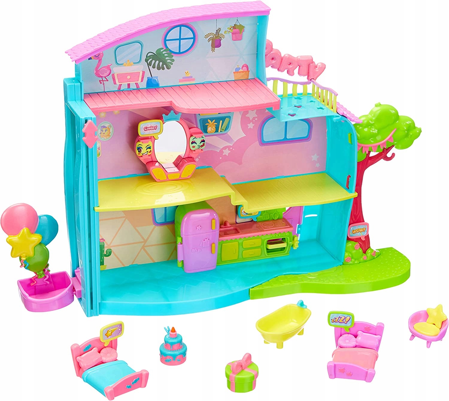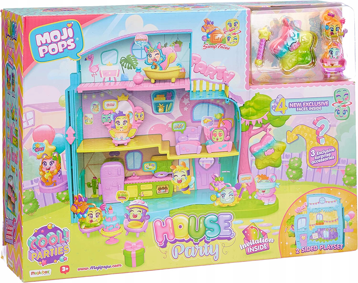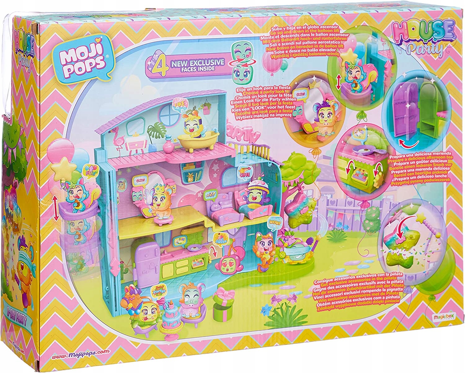 MojiPops zorganizowały wspaniałą domową imprezę! Czy dołączysz do zabawy? Dzięki windzie MojiPops dostaną się do wyższych części domu, gdzie mogą skorzystać z lustra, skakać po łóżkach, przygotować coś pysznego, a oprócz tego bawić się piniatą, która w swoim wnętrzu ukrywa niespodzianki.